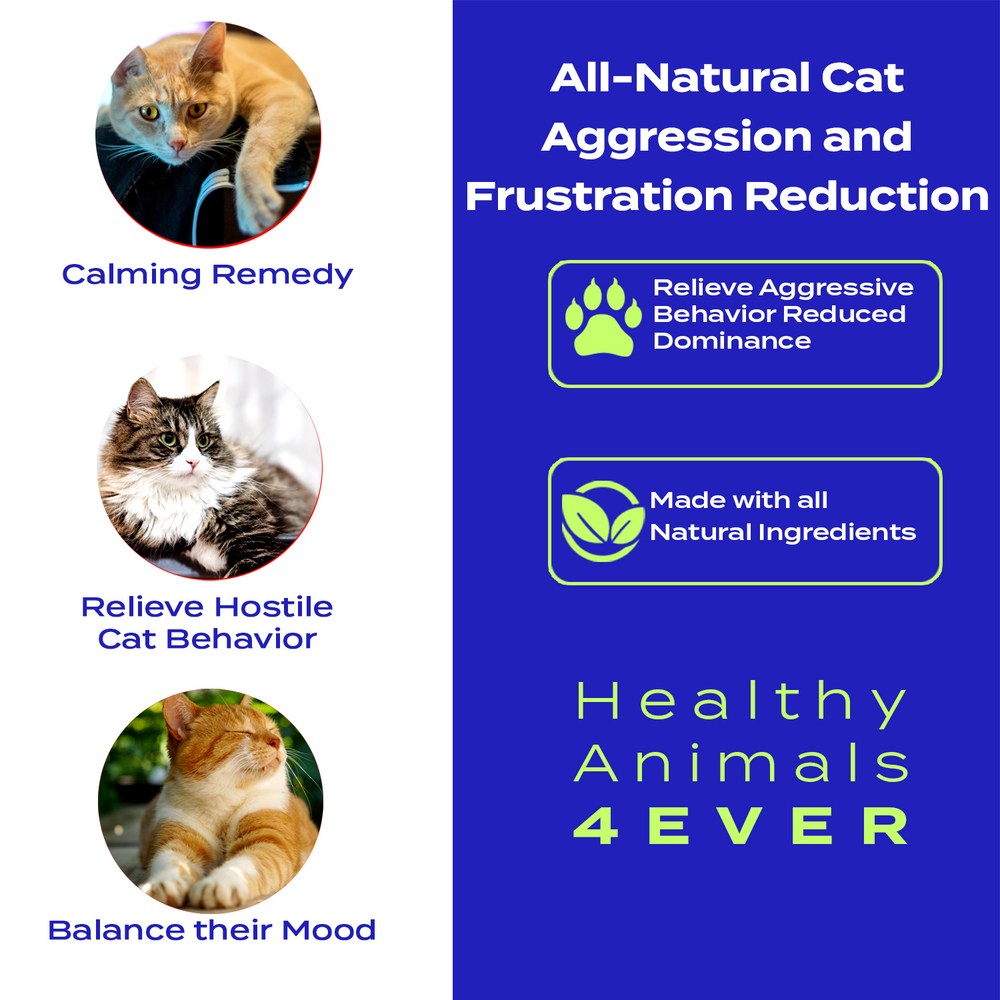 Frustration & aggression are caused by a big state of anxiety in your cat. This is caused by many underlying factors: fear, anxiety, or sexual urges. Our natural remedy reduces the dominance & aggression your cat may feel, and also may help relieve aggressive cat behavior in new or stressful situations. Keep in mind, that this is not a replacement for effective and consistent training. The key to our natural formula it's fast acting, completely safe and natural, very easy to take, and has no side effects.