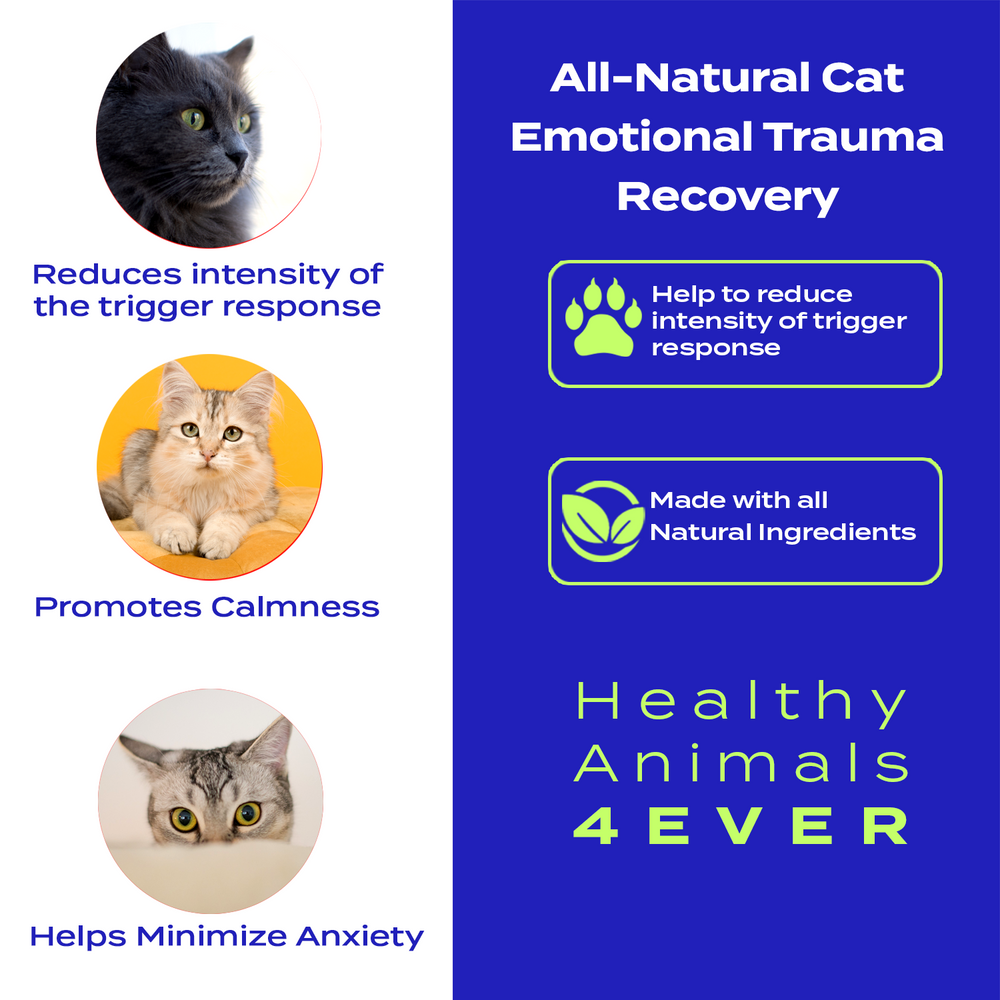 In Order to stop the symptoms of emotional trauma in cats, such as shaking, hiding, hypervigilance, easily being startled, agitation, fearfulness, urinating or defecation on something that triggers them, and/or avoidance of people. Try using our all-natural emotional trauma remedy for cats which can help with emotional trauma, stress, fear and nervousness, anxiety, or depression your cat may be feeling.