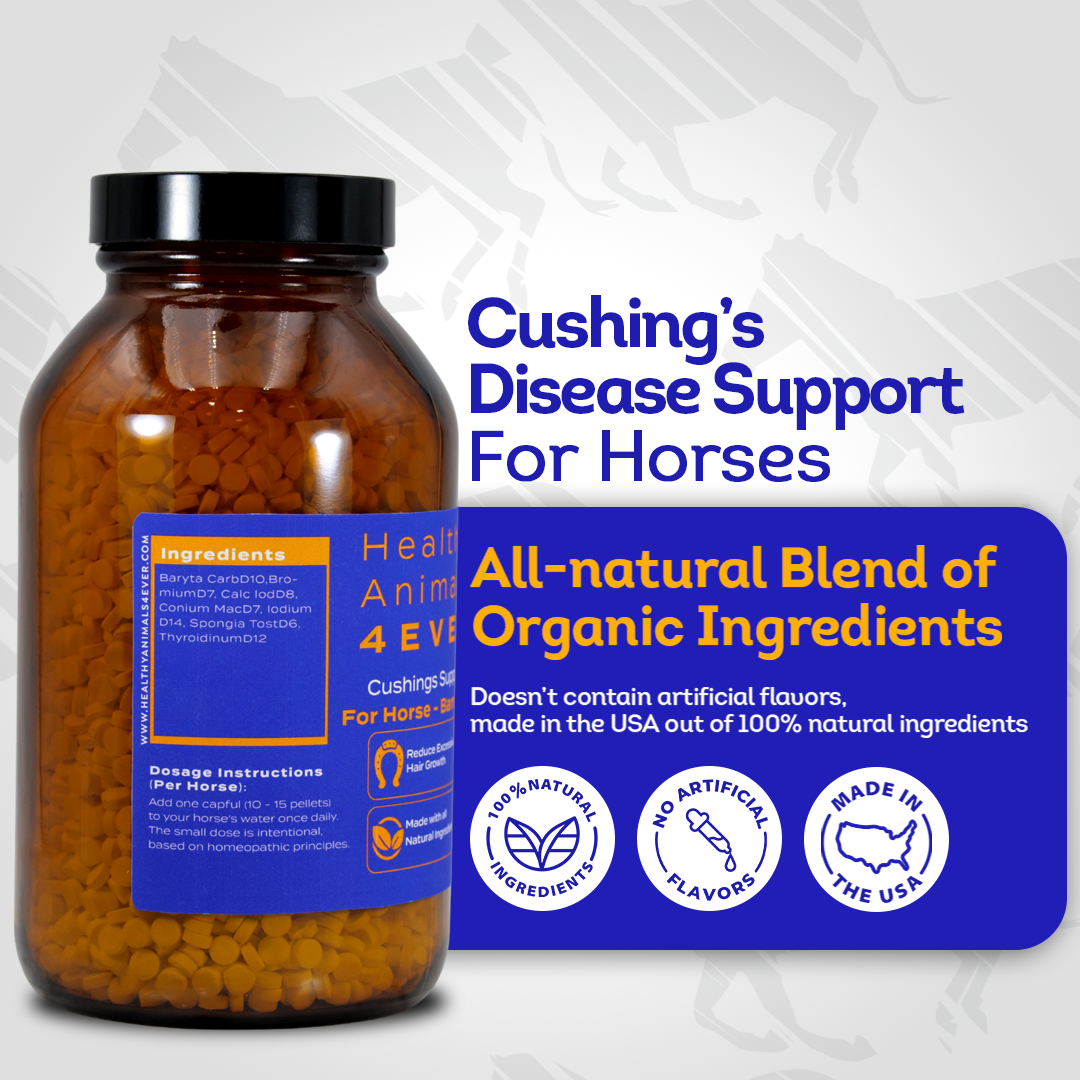 WHY CHOOSE OUR HORSE CUSHINGS DISEASE REMEDY? Unlike other standard treatments & medicines, our homeopathic remedy is gentle and free from harmful side effects, making it a safe option for all horse breeds. Remedies may be used alone or with other medical treatments as they cause no drug interactions. Watch as your horse experiences relief from the discomfort of Cushing's disease with restored vitality and well-being. And have complete peace of mind as you care for your pets with this all-natural, organic, non-GMO, gluten-free, preservative-free, and chemical-free supplement. Try it today for a better quality of life tomorrow!