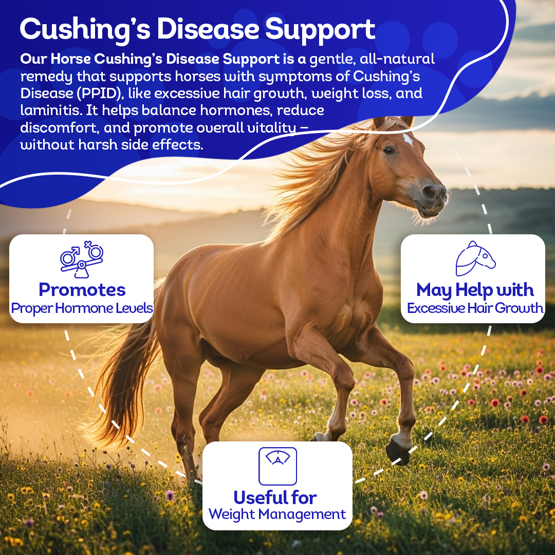 SYMPTOMS OF HORSE CUSHINGS DISEASE: Some main signs are excessive hair growth, weight loss, laminitis, abnormal fat distribution, muscle wasting, and increased thirst and urination. Cushing's disease in horses can be a challenging and distressing condition. Our all-natural Cushing's disease remedy is specially formulated to address these symptoms.